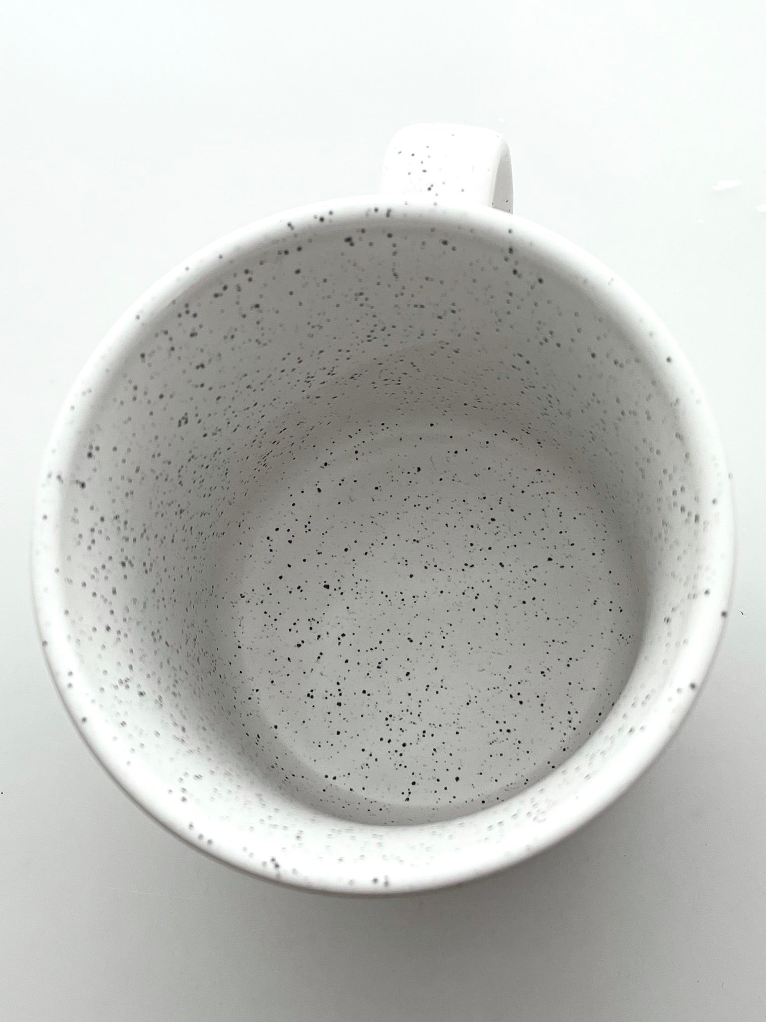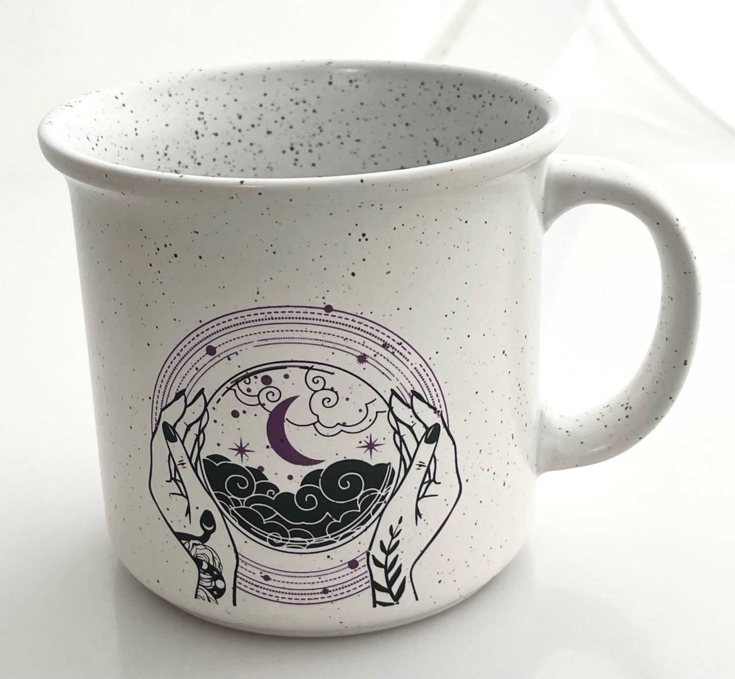 Mug is white with a black speckled finish. Crystal ball graphic is white & black.