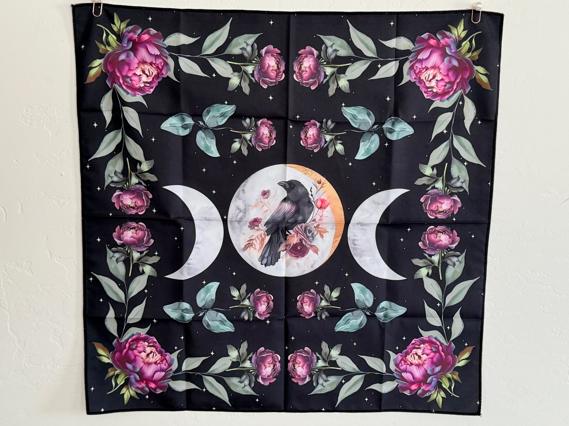 Adorn your sacred space with this captivating 19" square altar cloth, featuring the powerful imagery of Ravens, Moons, and the gentle beauty of Lavender Peonies. This design invites wisdom, deepens intuition, and fosters spiritual calm during your practice.